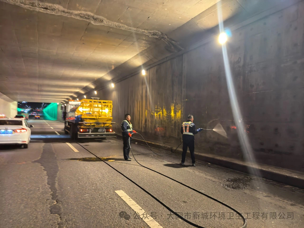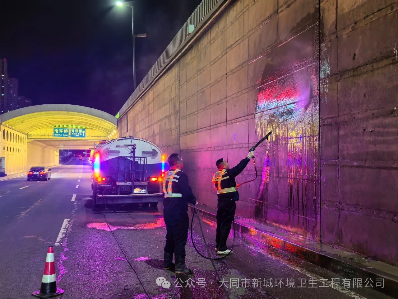 由于御河東路快速路下穿橋洞兩側墻面污泥、灰塵附著,影響我市市容環(huán)境和旅游城市面貌,4月18日起,新城環(huán)衛(wèi)公司對御河東路下穿橋洞開展專項清洗活動,在確保不影響道路交通的情況下,于每晚10點至次日凌晨2點期間,采取“機械+人工”相結合的方式,利用高壓清洗車對快速路下穿橋洞墻體進行全面沖洗,強大的水壓能夠有效去除附著在墻壁上的灰塵、污泥等污染物。使橋洞一改往日的“灰頭土臉”,有效改善了通行環(huán)境,為過往車輛提供了更加舒適干凈通行體驗。